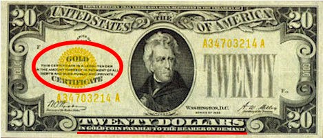 Tờ 20 đôla trước năm 1971. Lưu ý vùng được khoanh đỏ: "Chứng chỉ vàng" và "hai mươi đôla tiền vàng được trả cho người mang theo yêu cầu". |